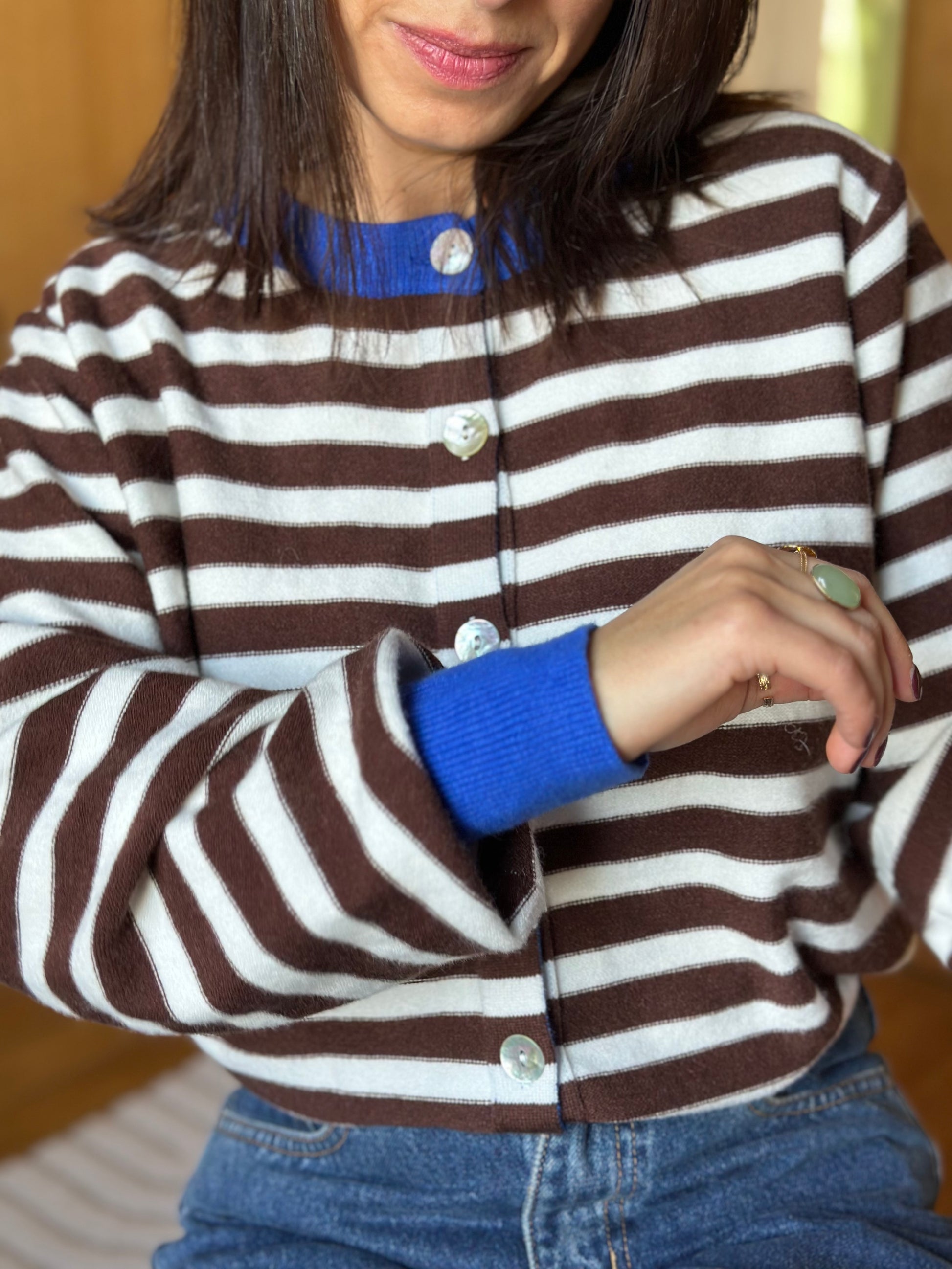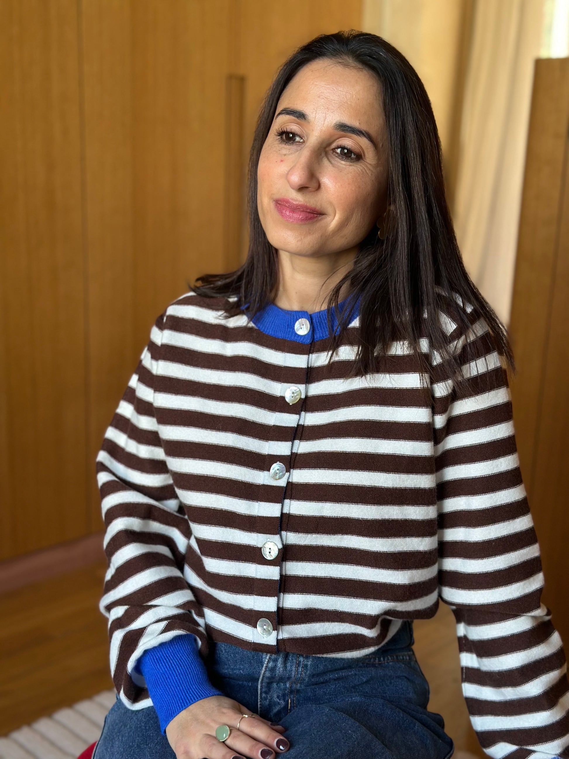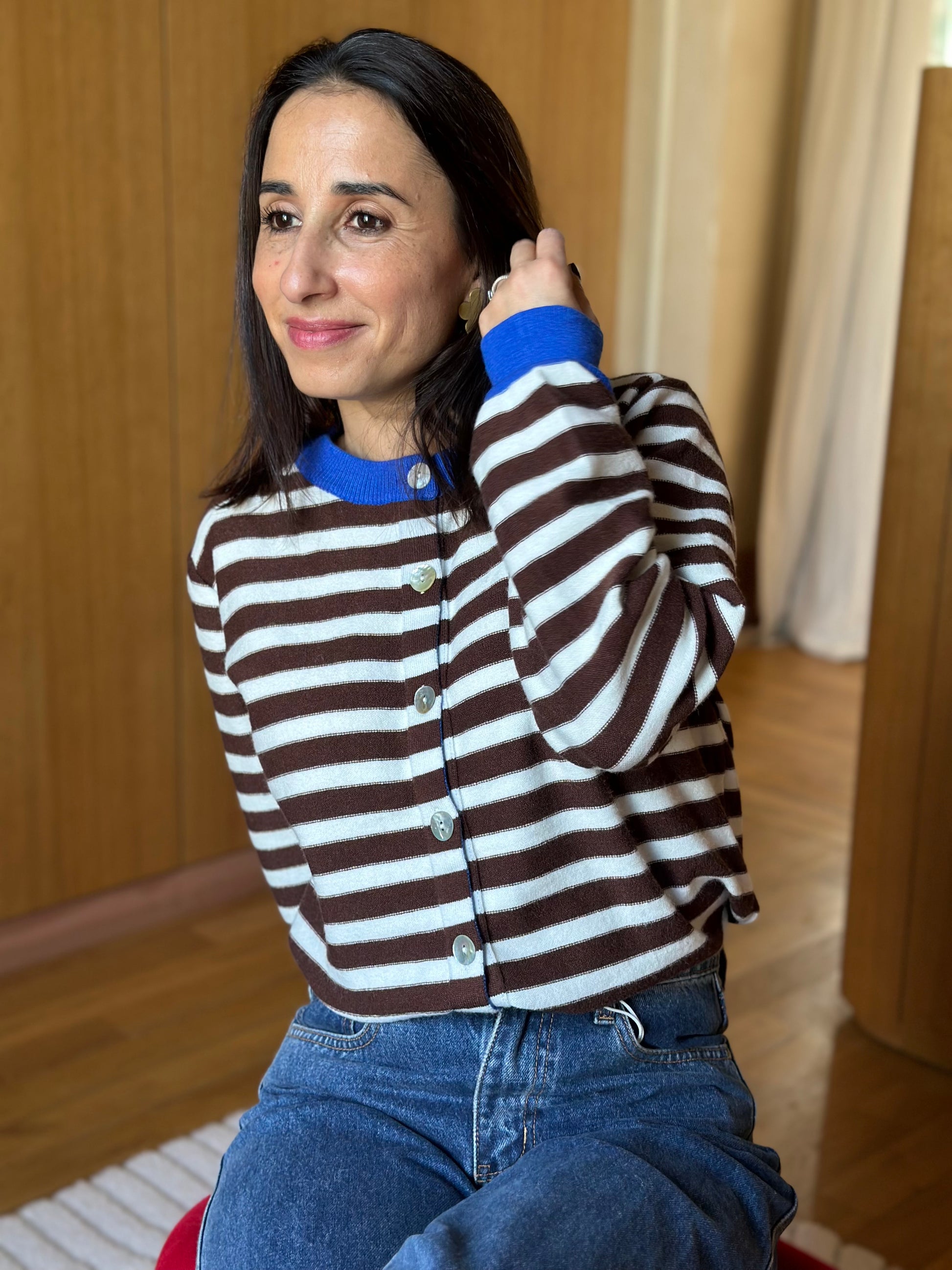 Le gilet Amir à rayures marron et blanc.