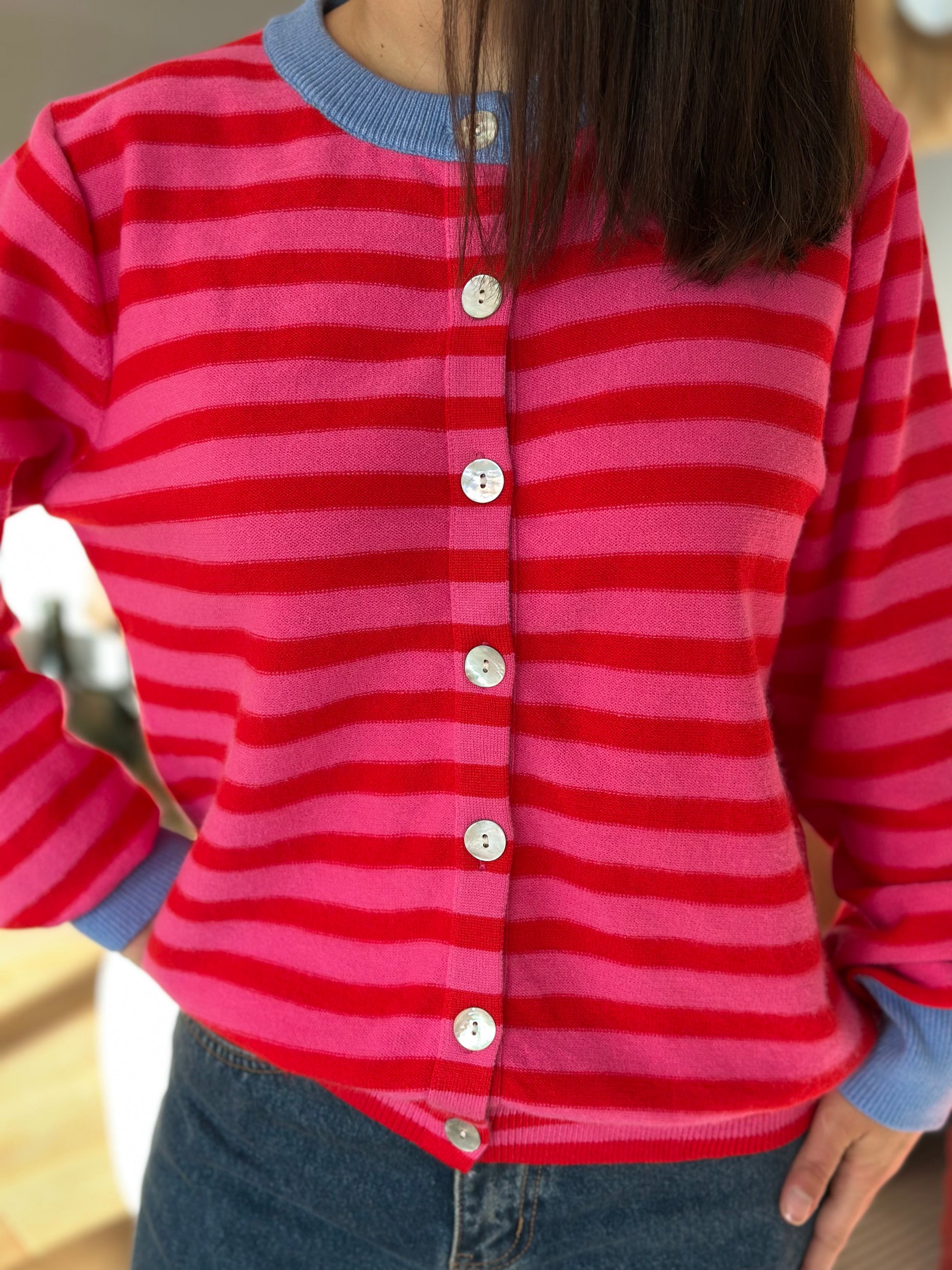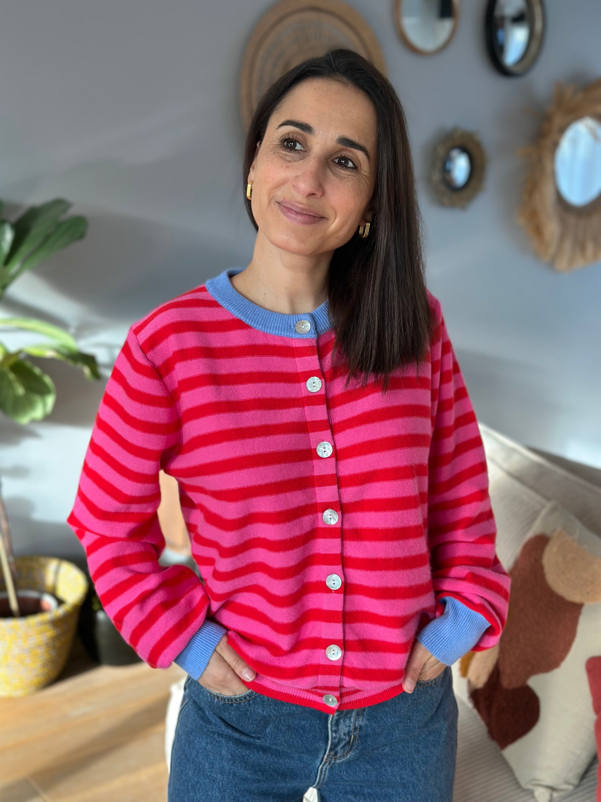 Le gilet Suzanne à col rond coloré pour le printemps et très agréable à porter.