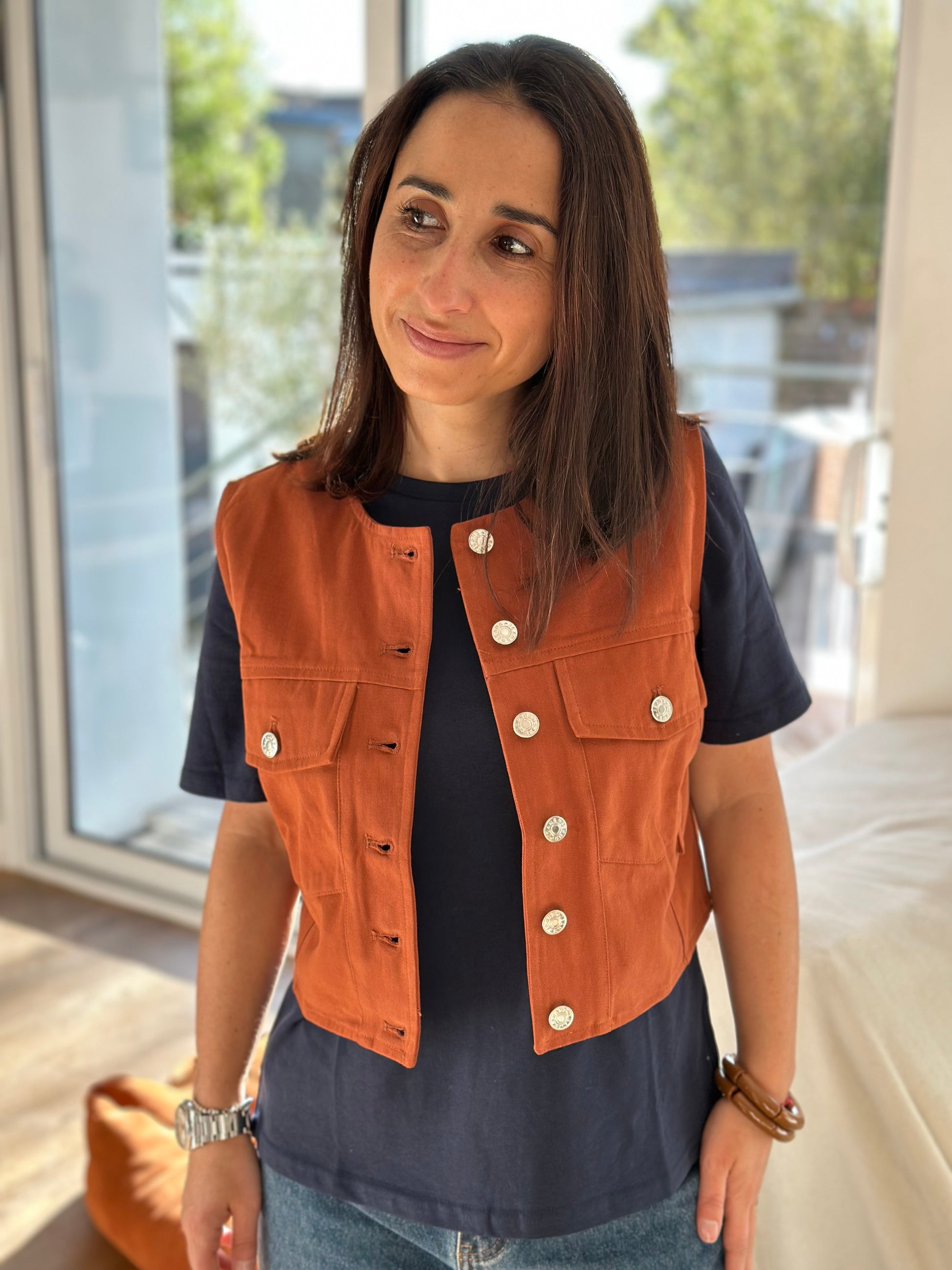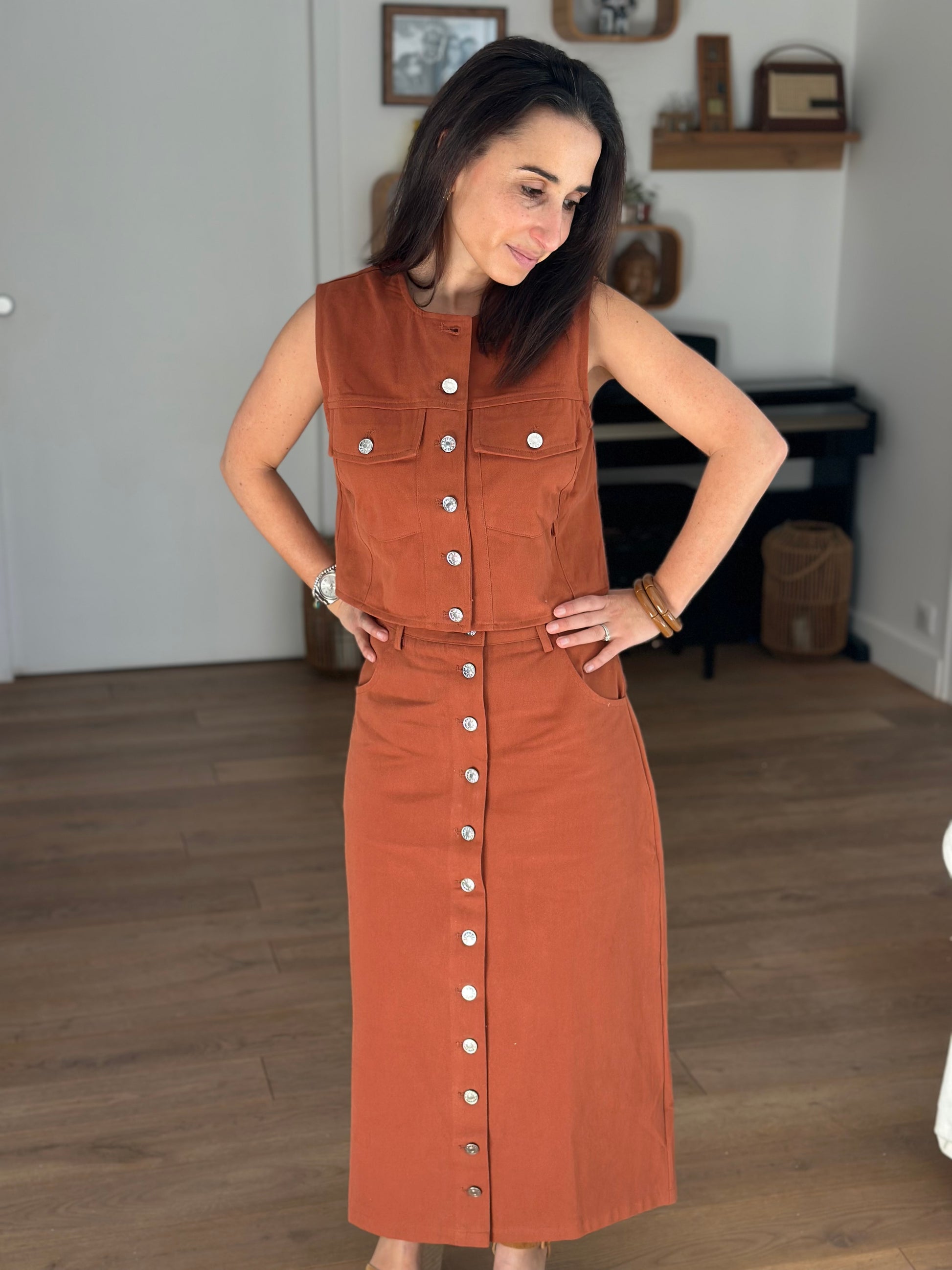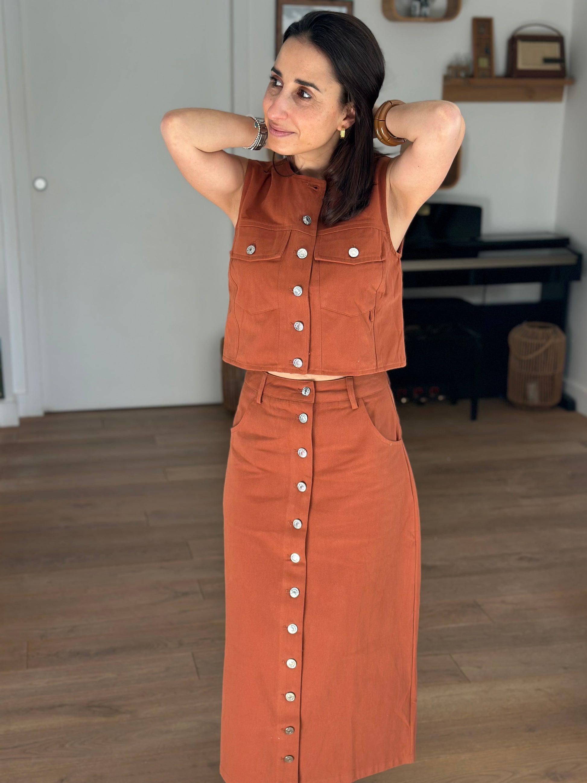 Magnifique haut Adam qui se porte aussi bien avec la jupe assortit qu'avec un jean ou une autre jupe .